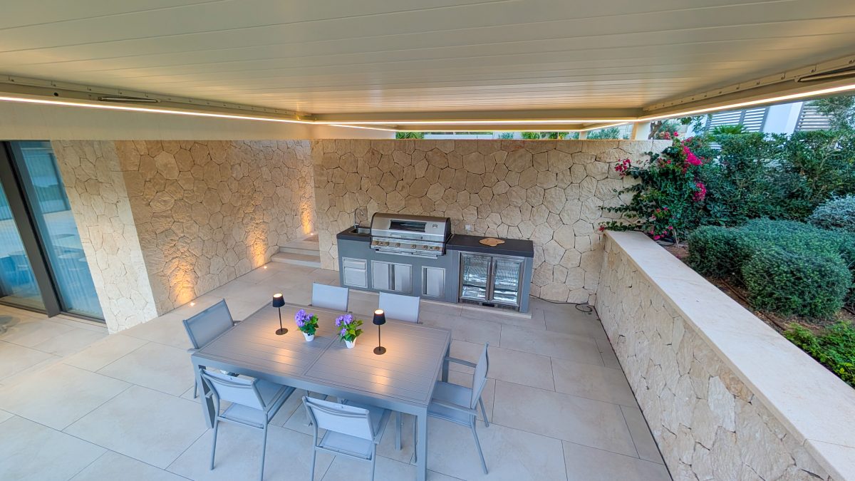 Von dem imposanten Eingangsbereich gelangt man in den lichtdurchfluteten Wohnbereich mit Kamin. Auf über 120m² bietet sich Ihnen eine offene Wohnlandschaft mit Blick auf Pool und Garten. Der weitläufige Terrassen- und Gartenbereich, der zudem über eine Außenküche verfügt, ist umlaufend mit dem Wohnbereich als auch der Küche des Hauses verbunden. Durch die großen, öffenbare Fensterflächen schaffen wir ein perfektes Wohnerlebnis, bei dem der Übergang zwischen Innen- und Außenflächen fließend ist.